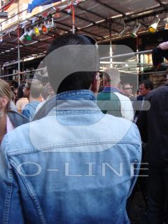 Description: Back of a man in the foreground looking over the crowd in the background.
