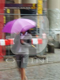 Lady walking in the rain with a purple-pink umbrella, blury |